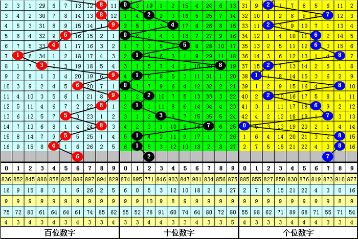 百个位合:前10期百个位两码合开出:9、5、0、4、1、4、2、8、3、2,其中百个位两码合012路比为3:3:4,奇偶比为4:6,本期看好百个位两码合开出奇数,注意两码合1、3、5。
